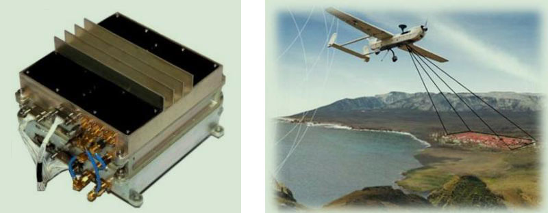 搭載于飛行器,側(cè)視工作,通過發(fā)射/接收大帶寬電磁波信號和采用合成孔徑技術(shù),實現(xiàn)對地高分辨二維成像,具有全天候、全天時工作能力。在戰(zhàn)術(shù)偵查監(jiān)視、地形測繪、應急救援等領(lǐng)域發(fā)揮重要作用。