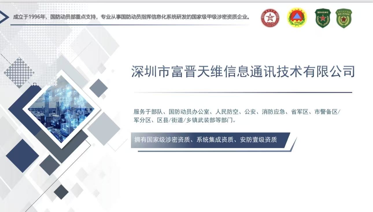 深圳市富晉天維信息通訊技術有限公司成立于1996年,專業(yè)從事國防動員、部隊、人防、公安、消防應急、智慧城市等領域指揮信息系統(tǒng)平臺設計研發(fā)和系統(tǒng)集成的高科技企業(yè)。擁有國家級涉密信息系統(tǒng)集成資質(zhì)、計算機系統(tǒng)集成資質(zhì)、軍工安防資質(zhì)、電子與智能化專業(yè)承包資質(zhì)和安全生產(chǎn)許可證等證書,是自主創(chuàng)新企業(yè)、深圳軟件百強企業(yè)。